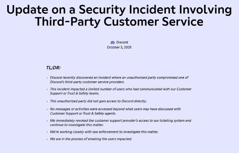Discord afirma que el ataque no comprometió sus servidores principales, mientras que los usuarios afectados recibieron un mensaje. Además, realizaron una notificación oficial a través de su sitio web. En el detalle, se reveló que la información vinculada a su sistema de atención al cliente pudo verse afectada.
